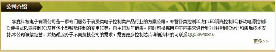 宇鑫科技:是一家专门服务于LED照明行业和消费电子产品行业的方案公司。主要从事各类消费类电子产品控制方案芯片的研发与销售。
